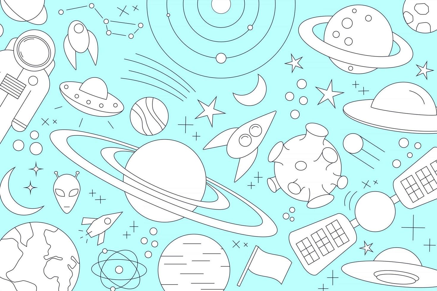 Modern pattern of planet star comet with different rockets Universe line drawings Cosmos Pro Vector