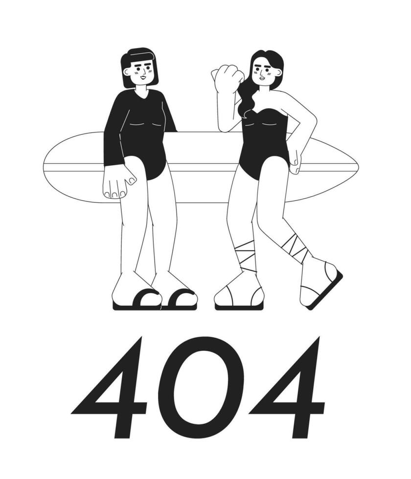 Young surfer girls with surfboard on beach black white error 404 flash message. Monochrome empty state ui design. Page not found popup cartoon image. Vector flat outline illustration concept Pro Vector