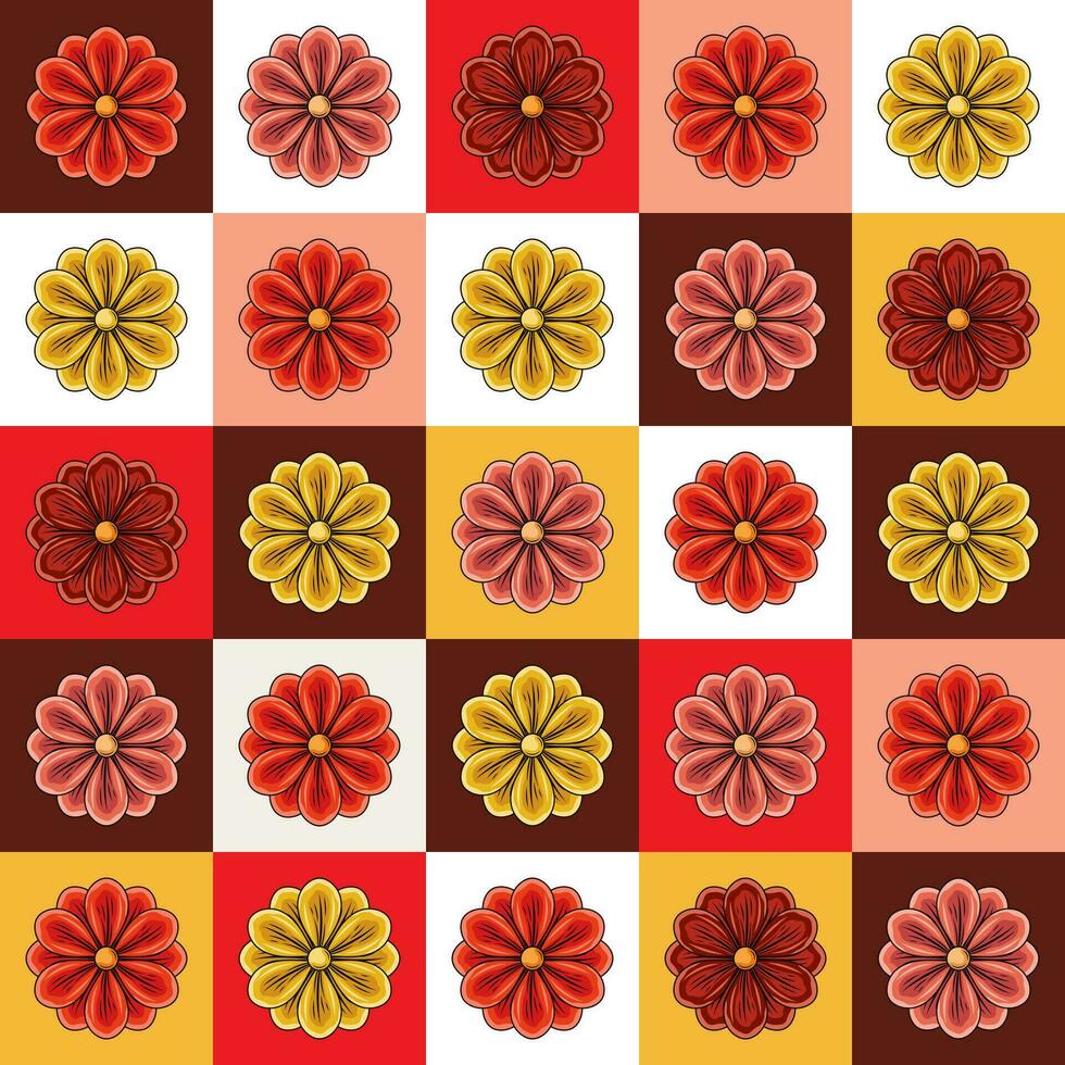 Seamless pattern with chamomiles, daisy in square geometric grid. Groovy, hippie retro style. Good for apparel, fabric, textile, surface design. Pro Vector