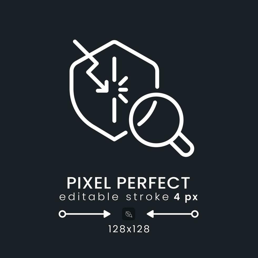 Penetration test white linear desktop icon on black. Vulnerability detection. Ethical hacking. Pixel perfect 128x128, outline 4px. Isolated user interface symbol for dark theme. Editable stroke Pro Vector