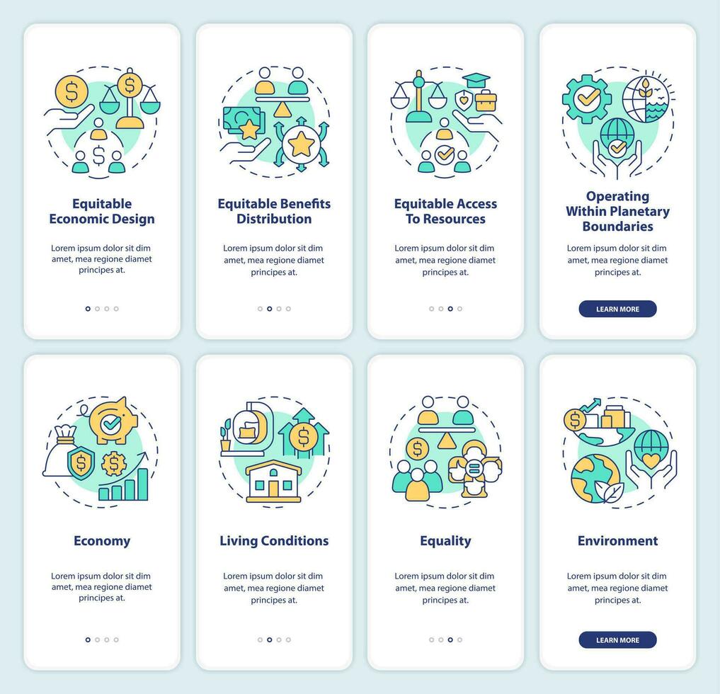 Inclusive economy attributes onboarding mobile app screen set. Walkthrough 4 steps editable graphic instructions with linear concepts. UI, UX, GUI templated Pro Vector