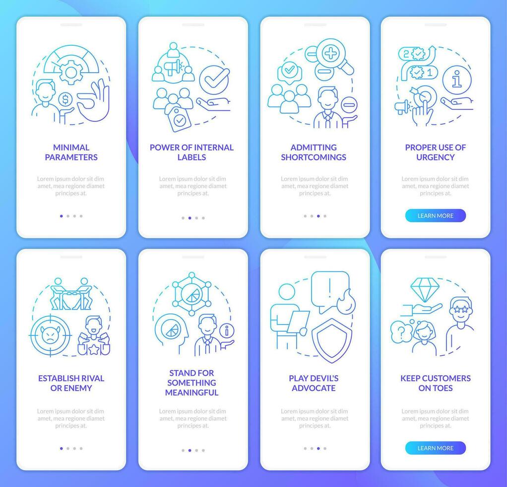 Psychological marketing blue gradient onboarding mobile app screen set. Walkthrough 4 steps graphic instructions with linear concepts. UI, UX, GUI templated Pro Vector