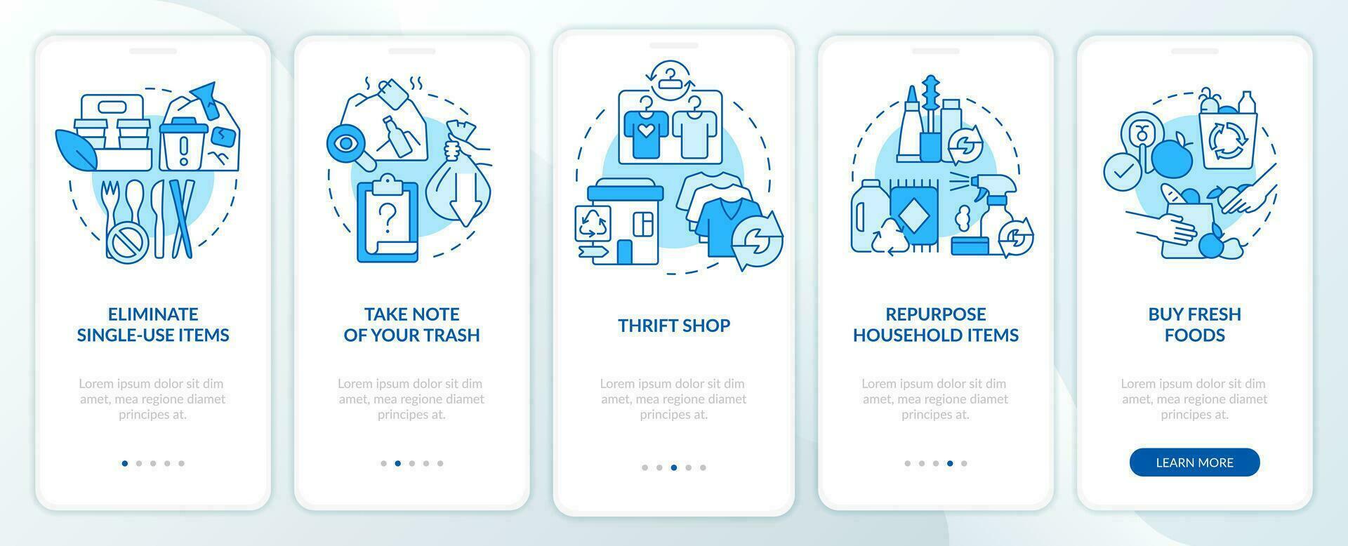 Switching to zero-waste lifestyle blue onboarding mobile app screen. Walkthrough 5 steps editable graphic instructions with linear concepts. UI, UX, GUI templated Pro Vector and Pro SVG