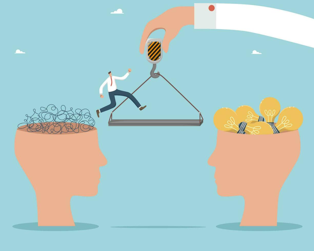 Help and cooperation in search of ideas for success, ways and methods of solving complex work problems, innovative and creative solutions, man jumps from a head with confused thoughts to a smart head. Pro Vector