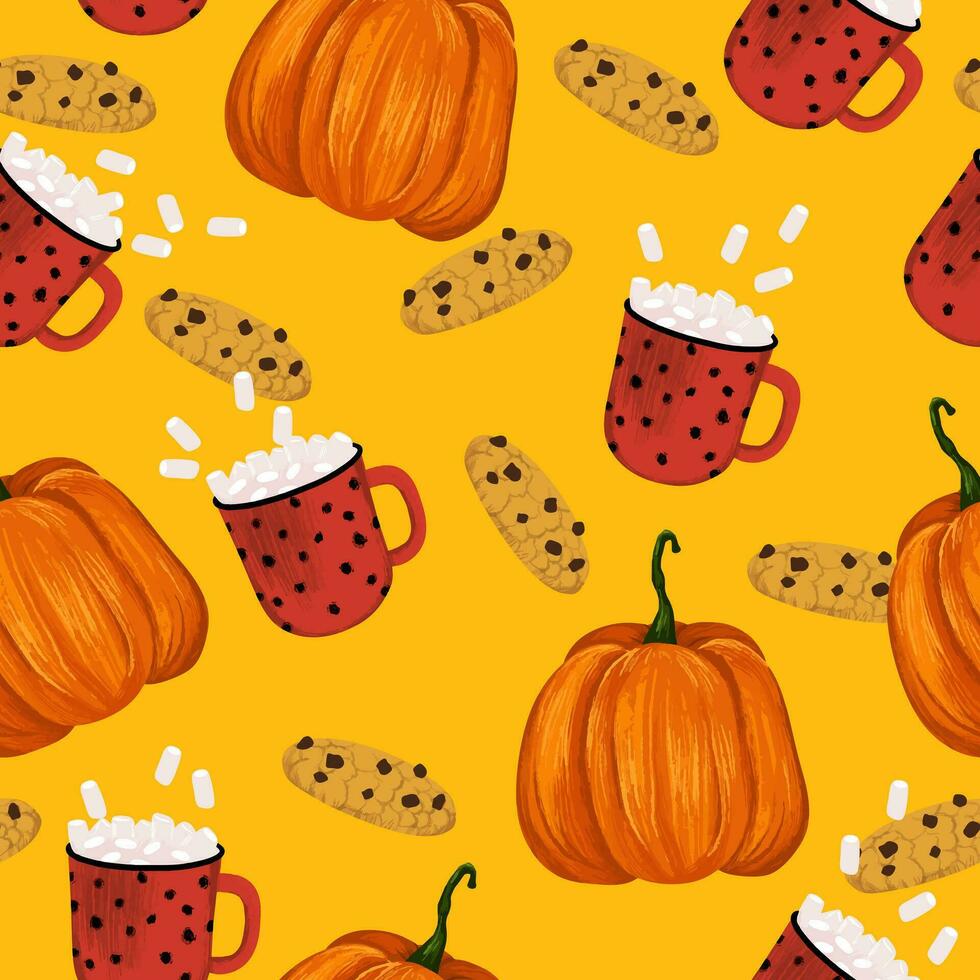 Seamless autumn pattern with pumpkin, cookies, mug of cocoa and marshmallow on orange background Pro Vector