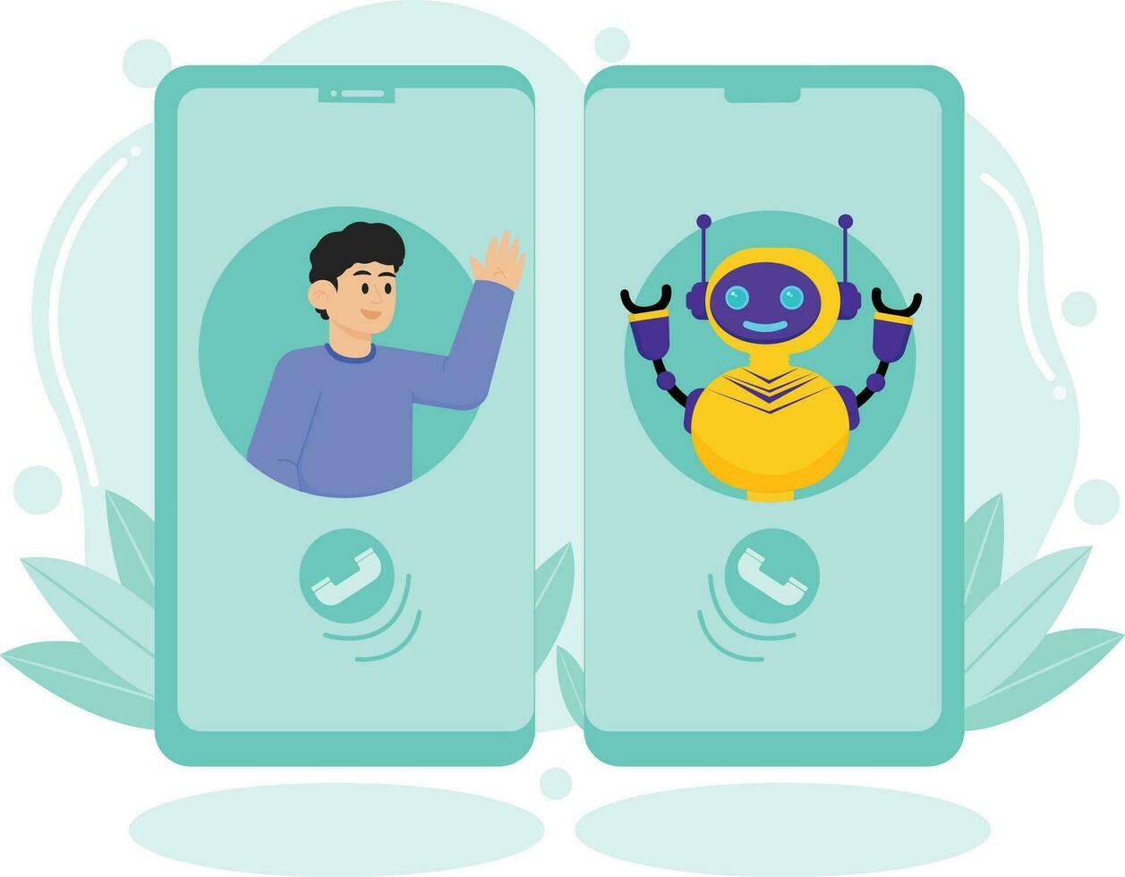 A Man and a Robot Greet Each Other Through a Mobile Function in Artificial Intelligence Illustration Pro Vector