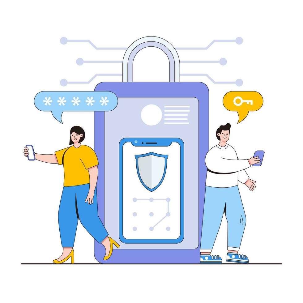 Mobile device security vector illustration concept with characters. Device encryption, secure lock screens, mobile security apps. Modern flat style for landing page, web banner, infographics Pro Vector