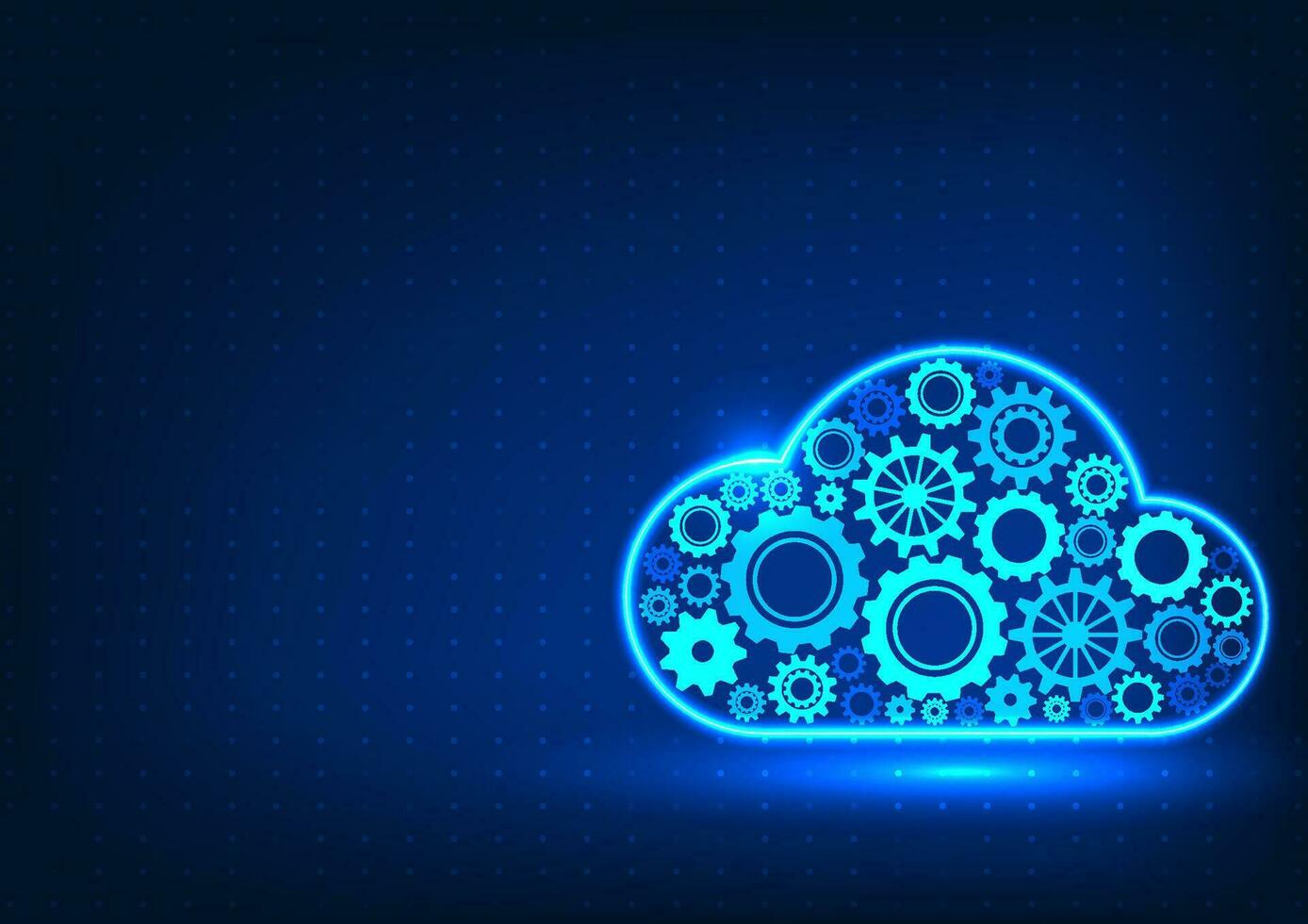 Cloud technology with gears Cogs inside the cloud drive data transmission and processing of data collection. through the internet Cloud technology concept that gradually drives business progress. Pro Vector