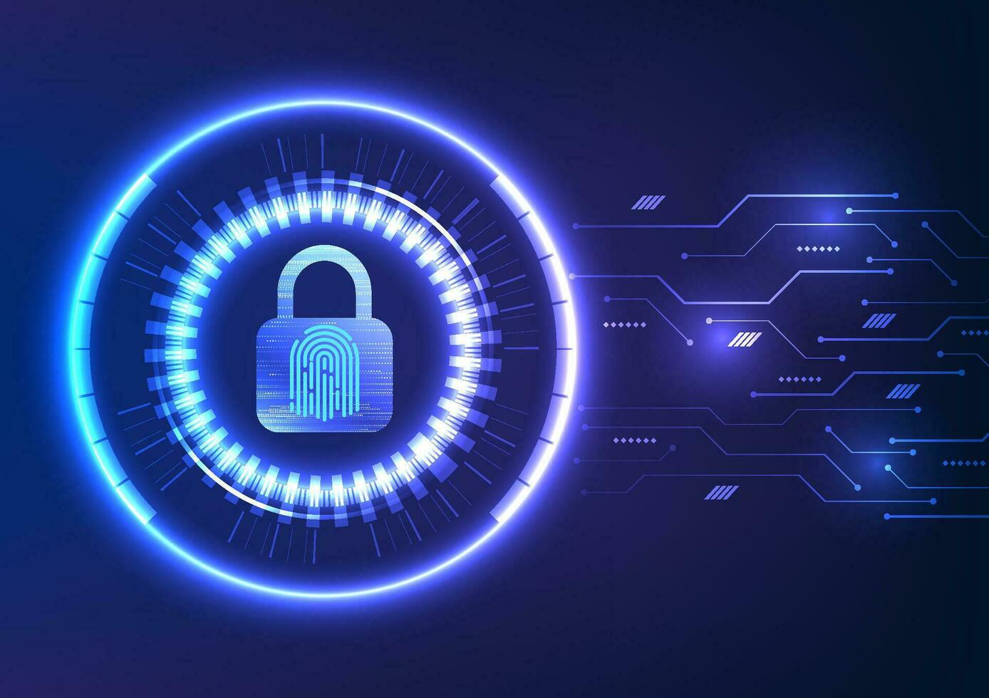 Lock with a fingerprint scanner, a glowing technology circle, and a circuit element. Discover the concept of data protection, emphasizing cyber security and data privacy. Pro Vector