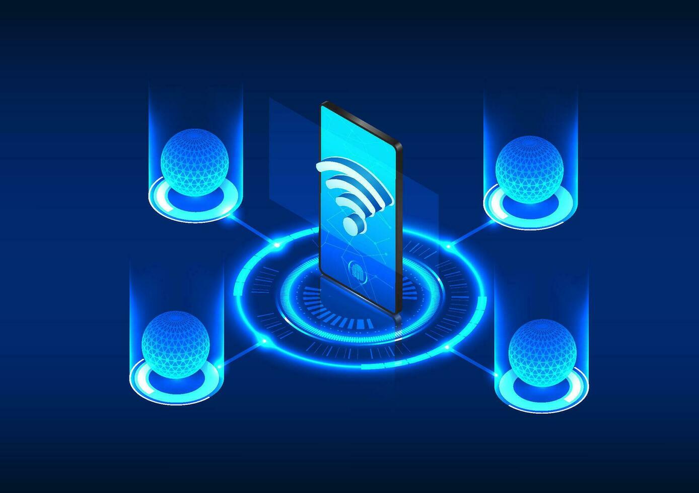 Tech backdrop with smartphone at center, surrounded by Wi-Fi symbol and processor-connected lines. Glowing tech circle at phone's bottom. Illustrating Wi-Fi connection to mobile devices Pro Vector