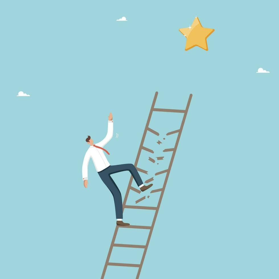 Business failure, competitive defeat and loss of reward, unexpected force majeure, choosing a losing strategy, wrong way of development, unjustified risk, man falls from stairs leading to the star. Pro Vector