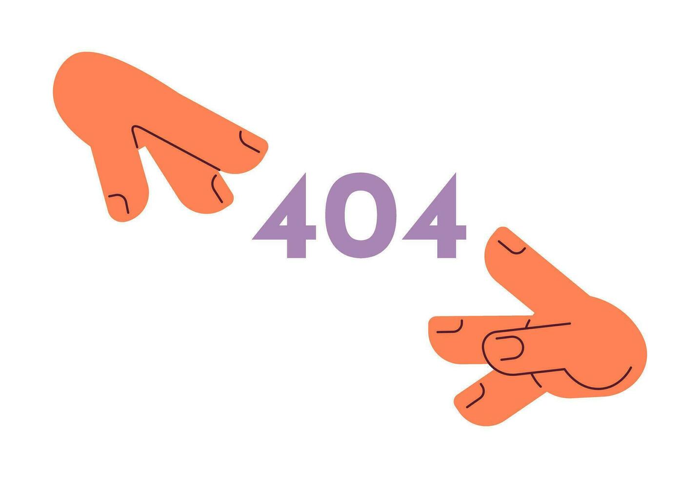 Hands reaching to error 404 flash message. Empty state ui design. Fingers try to touch. Page not found popup cartoon image. Vector flat illustration concept on white background Pro Vector