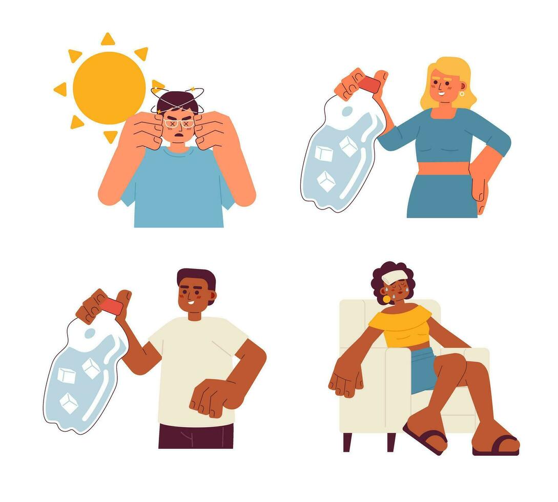 Overheated dehydration in summer flat concept vector spot illustration set. Heatstroke 2D cartoon characters on white for web UI design. Summertime heat wave isolated editable creative hero image pack Pro Vector