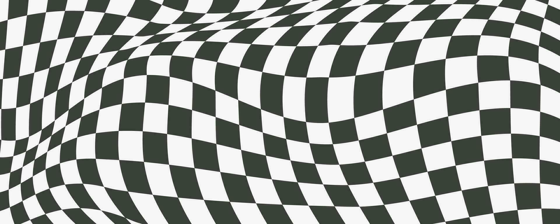 Checkerboard wavy pattern. Abstract chess square print. Black and white psychedelic optical illusion. Warped flag with geometric graphic. Y2k design for banner Pro Vector