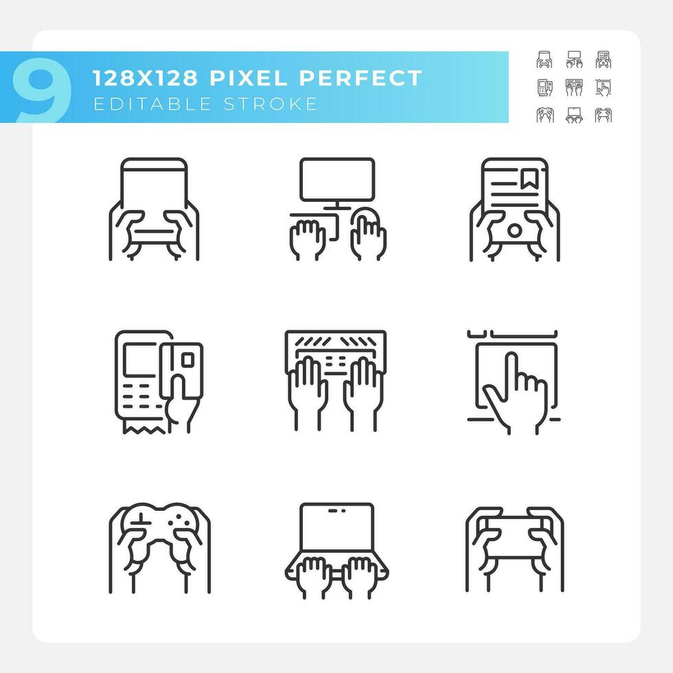 Hands using gadgets pixel perfect linear icons set. Technology of business and entertainment. Hardware user. Customizable thin line symbols. Isolated vector outline illustrations. Editable stroke Pro Vector and Pro SVG