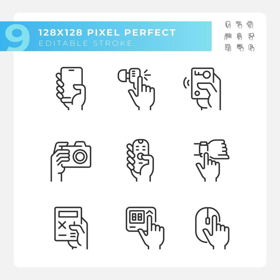 Hands holding electronic gadgets pixel perfect linear icons set. Digital equipment usage. Technology for life. Customizable thin line symbols. Isolated vector outline illustrations. Editable stroke Pro Vector and Pro SVG