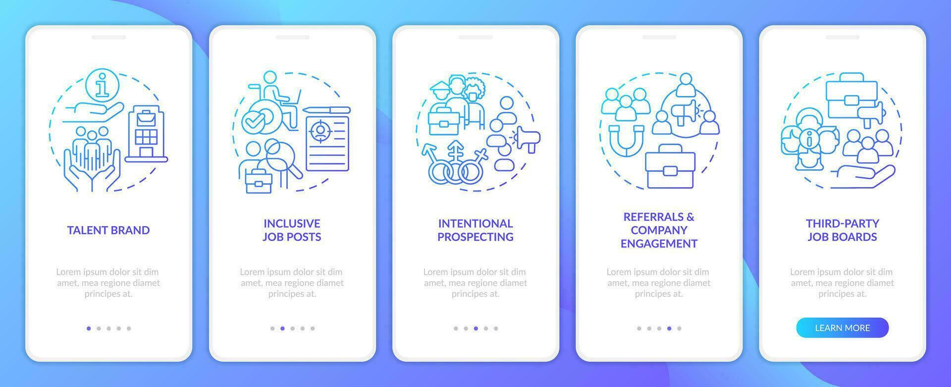 Diversifying pipeline of candidates blue gradient onboarding mobile app screen. Walkthrough 5 steps graphic instructions with linear concepts. UI, UX, GUI template Pro Vector and Pro SVG