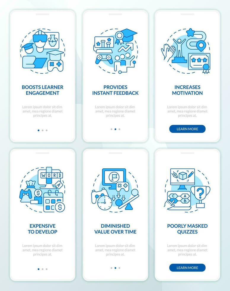Gamification pros and cons blue onboarding mobile app screens set. Walkthrough 3 steps editable graphic instructions with linear concepts. UI, UX, GUI templated Pro Vector and Pro SVG
