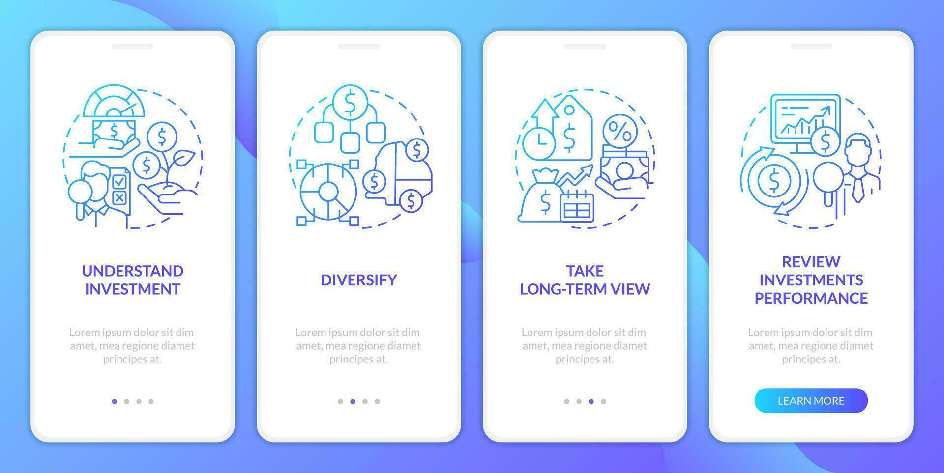 Investing rules blue gradient onboarding mobile app screen. Trading walkthrough 4 steps graphic instructions with linear concepts. UI, UX, GUI templated Pro Vector and Pro SVG