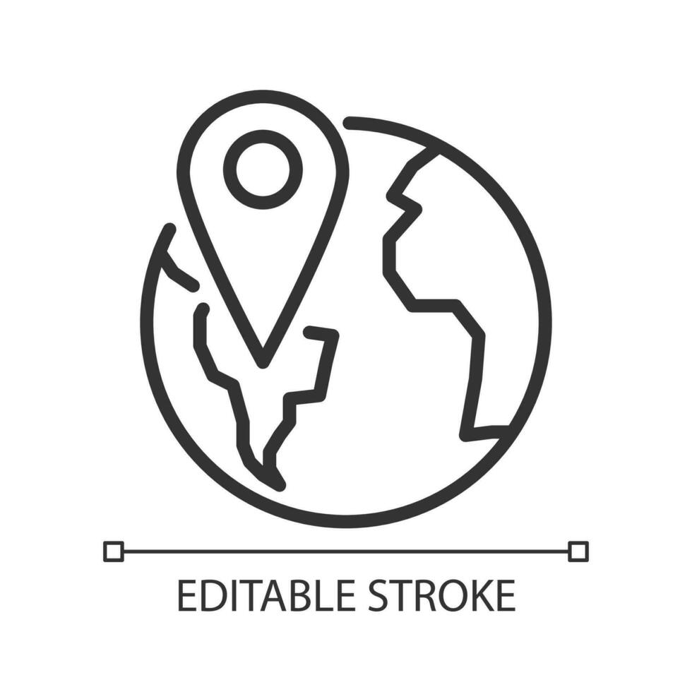 Globe with pin pixel perfect linear icon. Word navigation. Earth with destination mark. Thin line illustration. Contour symbol. Vector outline drawing. Editable stroke Pro Vector