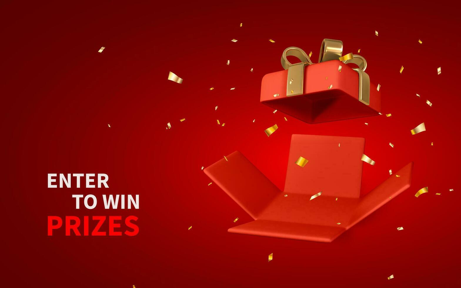 3D render and draw by mesh realistic open red gift box and confetti. Enter to Win Prizes. Vector Illustration Pro Vector