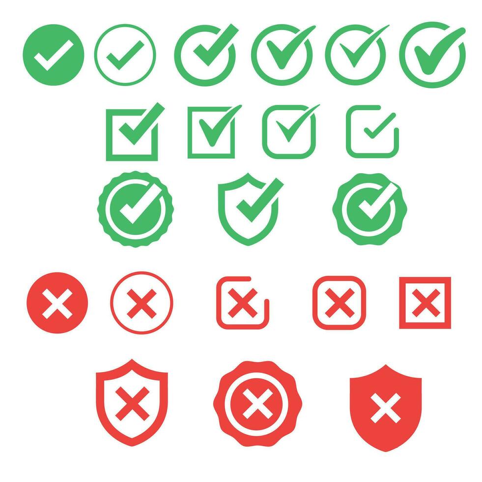 Tick and cross brush signs. Green checkmark OK and red X icons, isolated on white background. Simple marks graphic design. Symbols YES and NO button for vote, decision, web Pro Vector