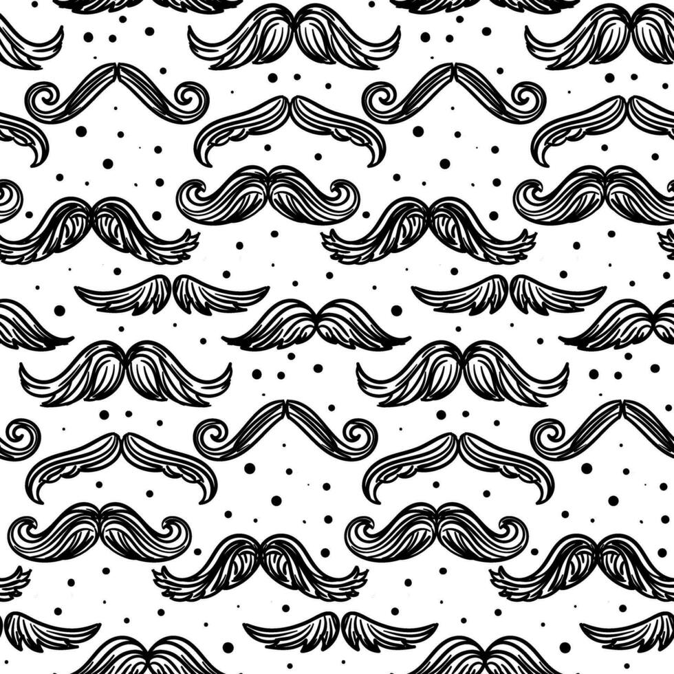A pattern of graphic icons with a hipster mustache in the grunge style. A large collection of mustaches with linear texture and dot decor. Vector illustration. For printing on textiles and paper