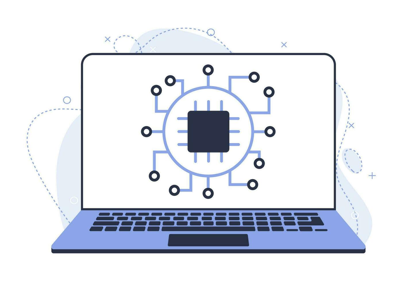 Illustration of a laptop with an updated chip. New software version. Improved characteristics vector