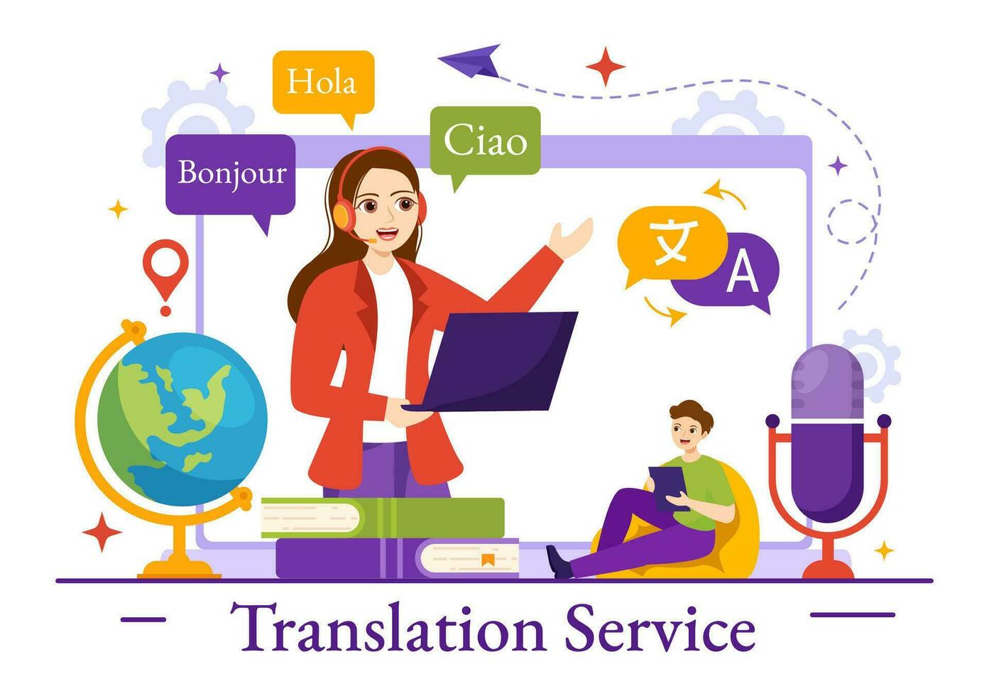 Translator Service Vector Illustration with Language Translation Various Countries and Multilanguage Using Dictionary in Hand Drawn Templates Pro Vector