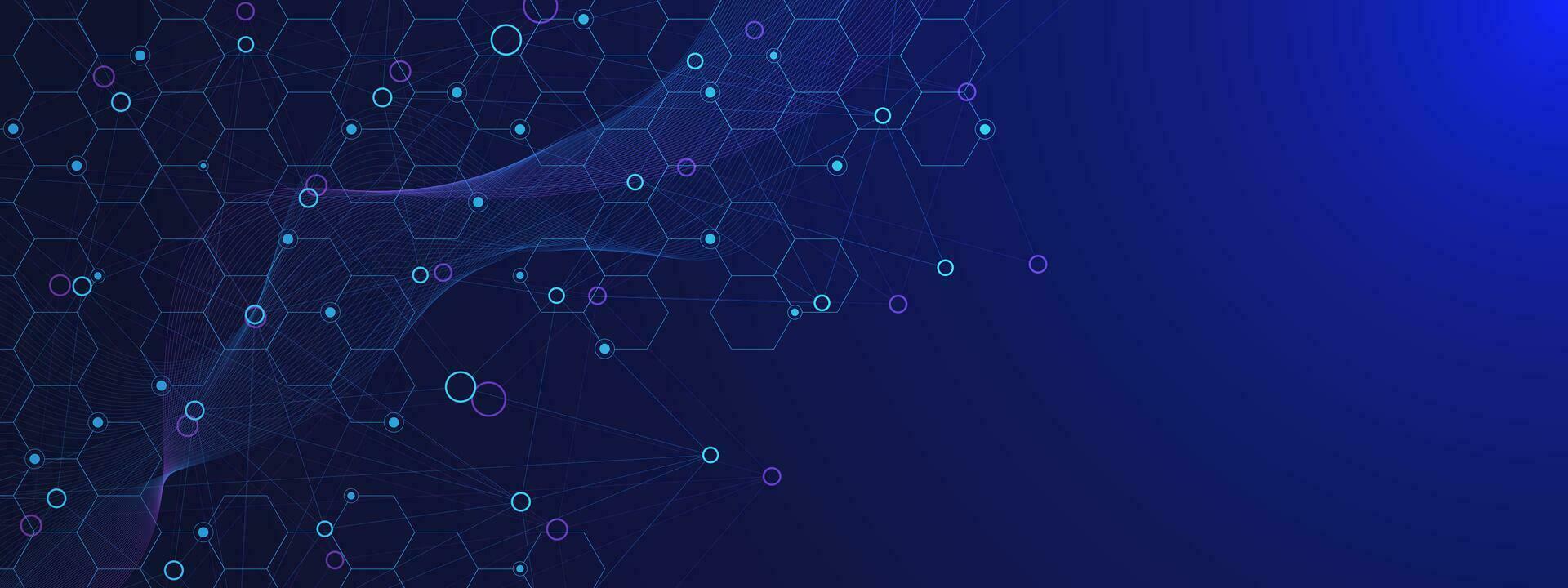 Abstract hexagonal shapes with connecting lines and circle. Modern scientific patter. Molecular structure, chemistry, science and technology background. Vector illustration. Pro Vector