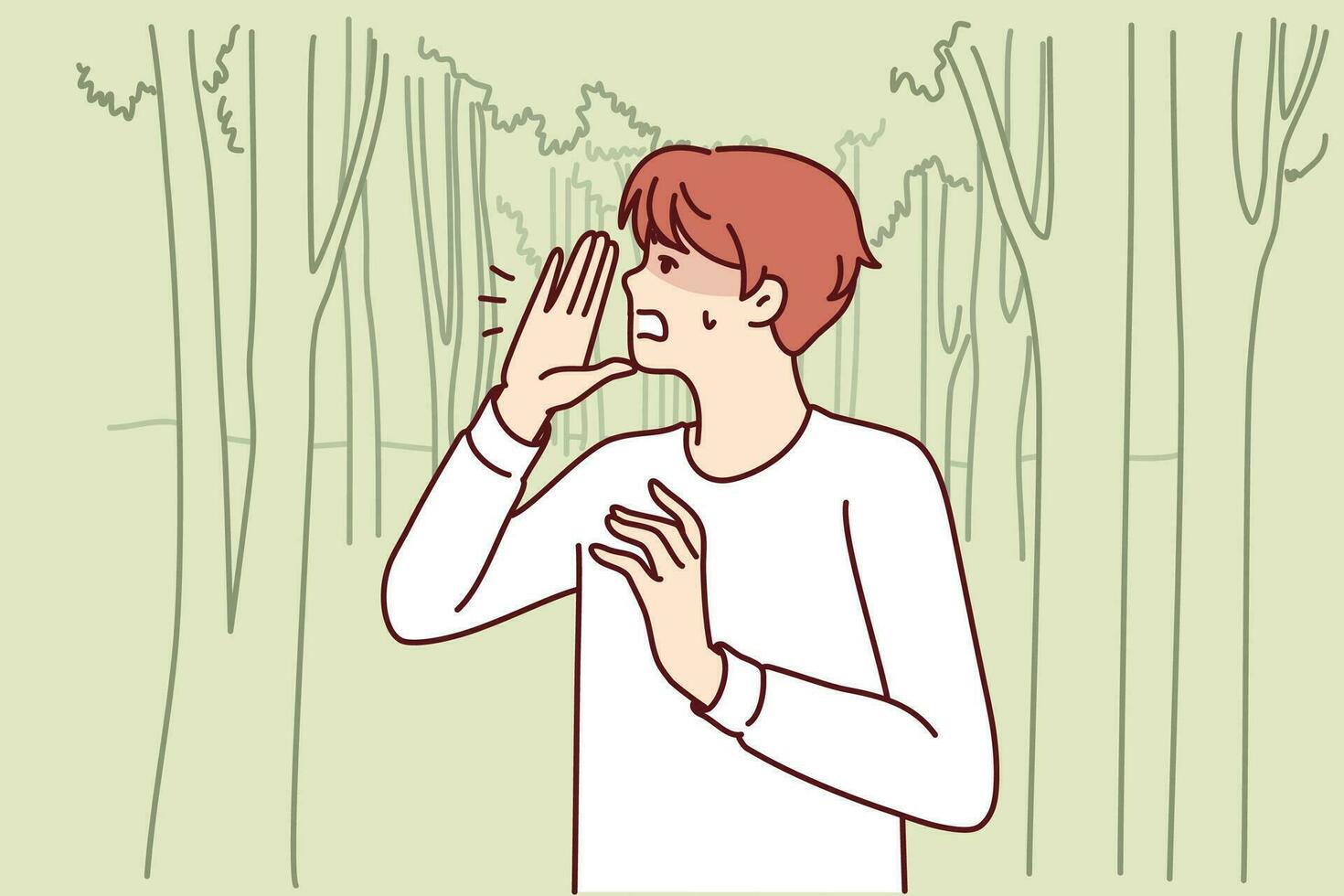 Man lost in forest screams trying to call for help and find way home among densely growing trees. Frightened guy millennial walking in woods lost due to lack of map or navigation devices Pro Vector