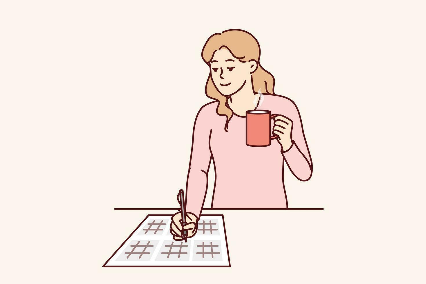 Woman solves sudoku puzzle and drinks hot tea enjoying math brain teasers. Young girl with sudoku puzzles on paper demonstrates high IQ, coping with mathematical examples with ease Pro Vector