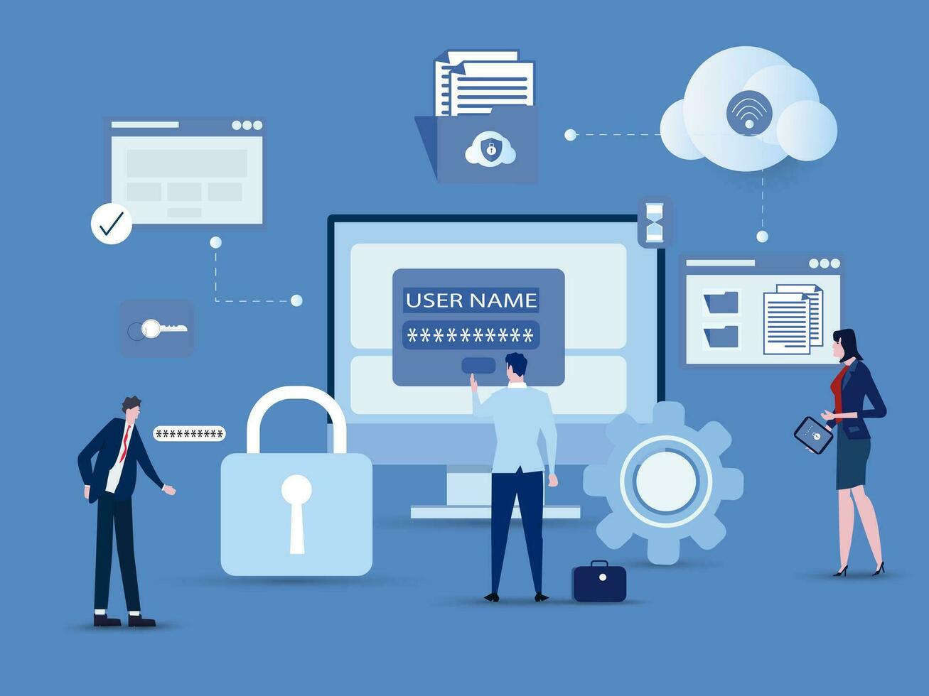 Business technology document management system storage backup concept and cloud server service with administrator and developer team working concept.flat vector illustration. Pro Vector