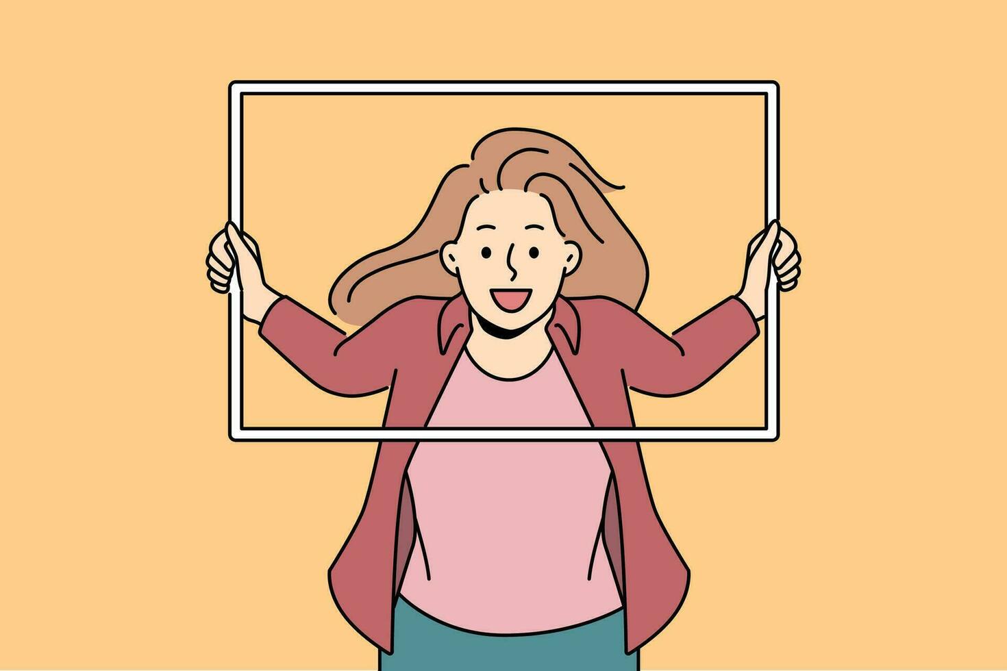 Smiling woman with empty frame posing making picture. Happy girl put face for picture or photo in frame. Photo shoot and modeling. Vector illustration. Pro Vector