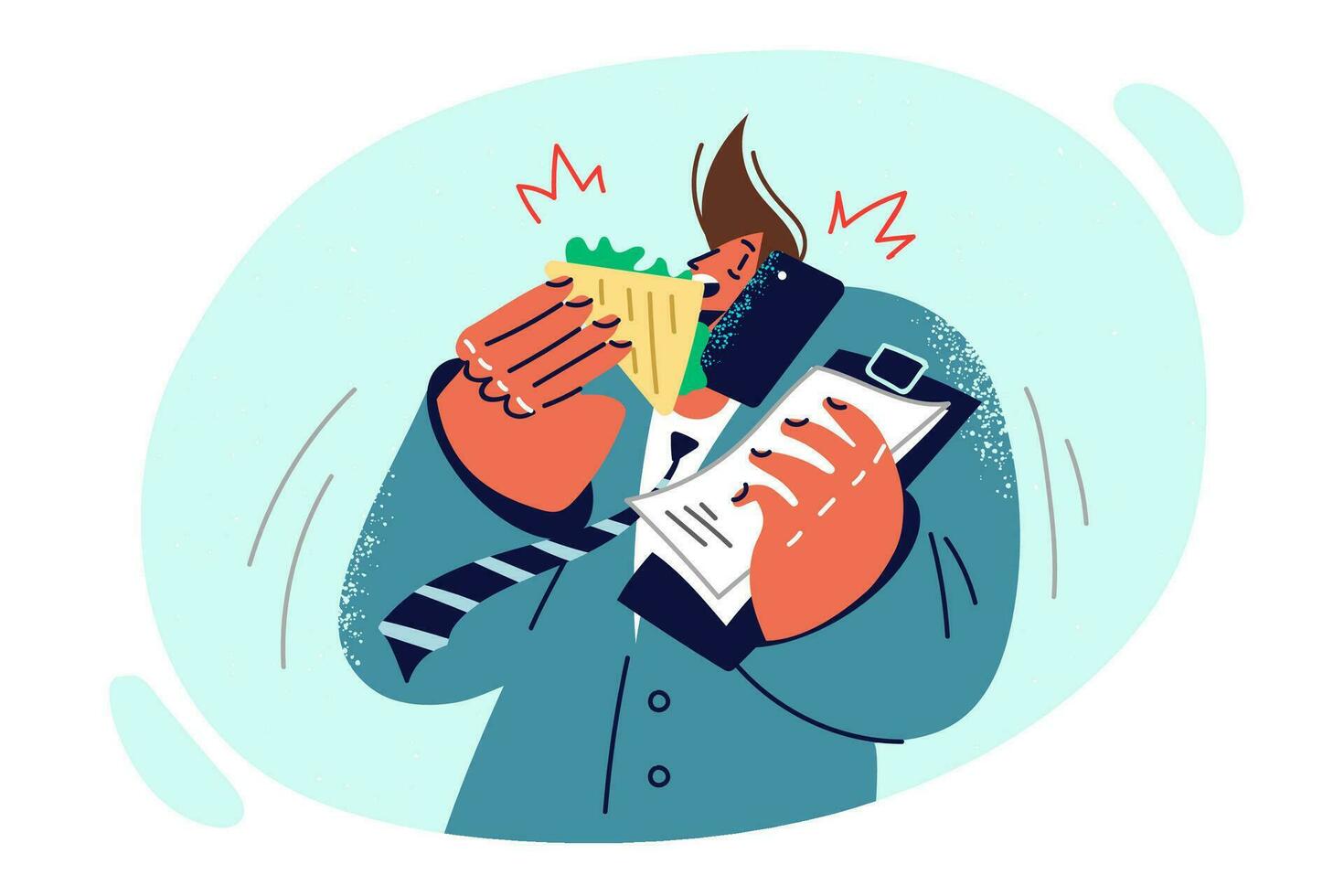 Busy business man eating and talking on phone at same time, working in multitasking mode. Guy in business suit suffers from overwork and lack of time for full meal due to strict deadlines. Pro Vector