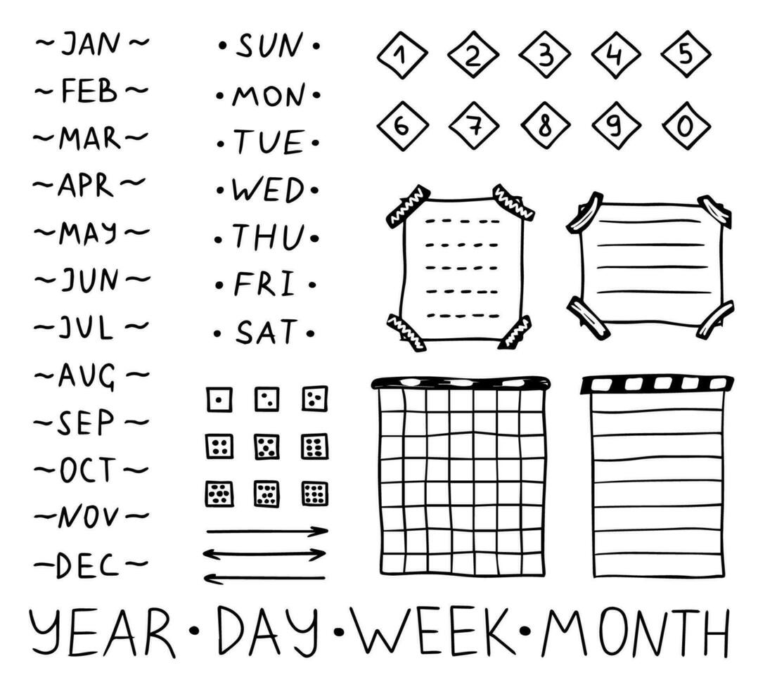 Bullet journal doodle set. Hand drawn elements, numbers, month names and days of the week, stickers, planner labels. Sketch scribble style. Vector illustration for diary, planner, notebook Pro Vector