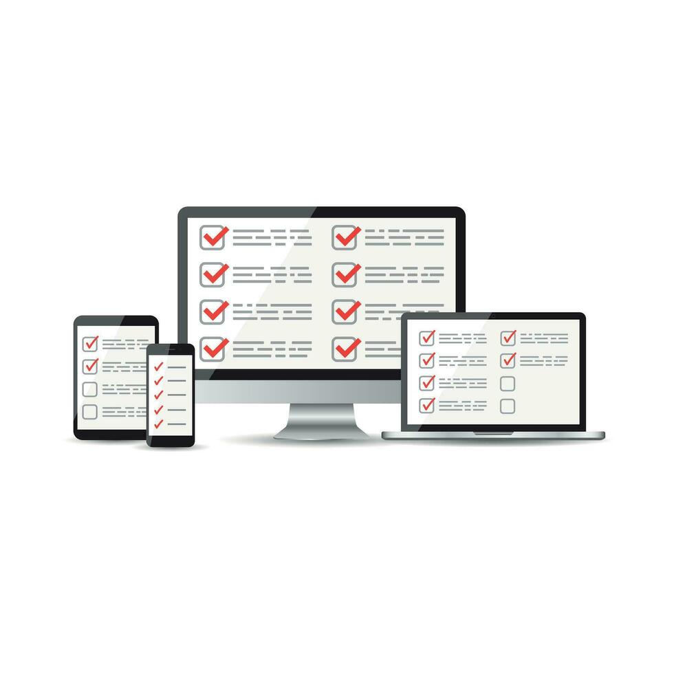 Online survey, checklist set. Tablet, computer, mobile blank screen. Feedback business concept. Flat vector illustration for web site, mobile app. Pro Vector