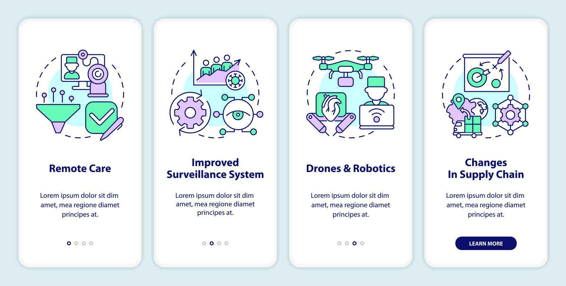 Healthcare in post pandemic era onboarding mobile app screen. Walkthrough 4 steps editable graphic instructions with linear concepts. UI, UX, GUI templated Pro Vector