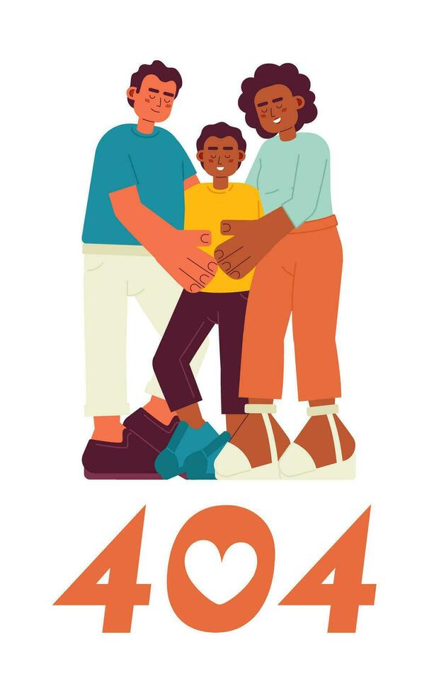 Mixed race family hug candid error 404 flash message. Dad and mom hugging preteen son. Empty state ui design. Page not found popup cartoon image. Vector flat illustration concept on white background Pro Vector