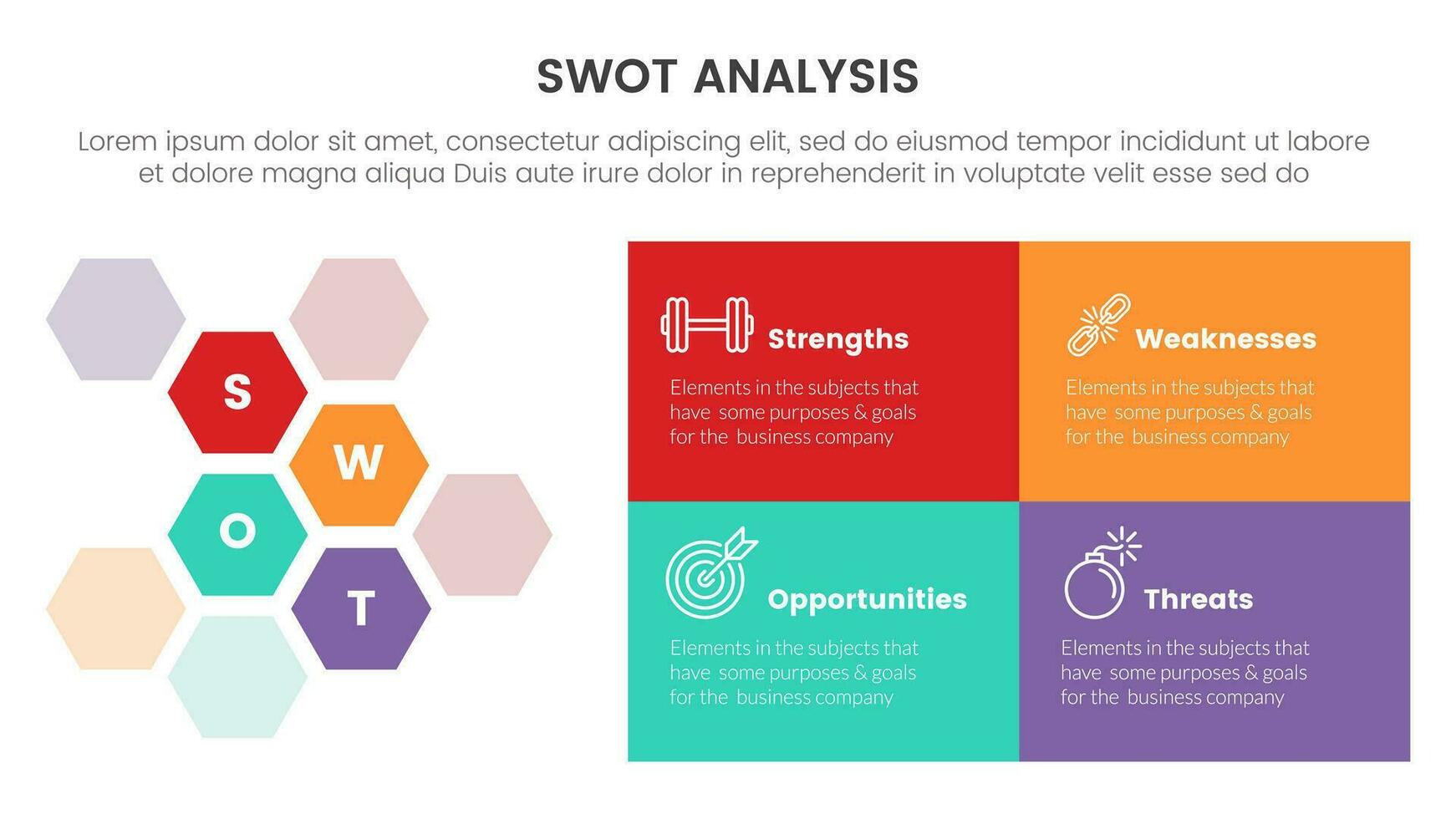 swot analysis concept with for infographic template banner with honeycomb and rectangle box four point list information vector