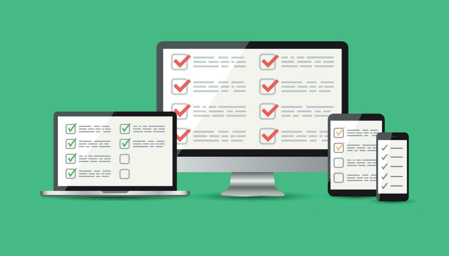 Online survey, checklist set. Tablet, computer, mobile blank screen. Feedback business concept. Flat vector illustration for web site, mobile app. Pro Vector