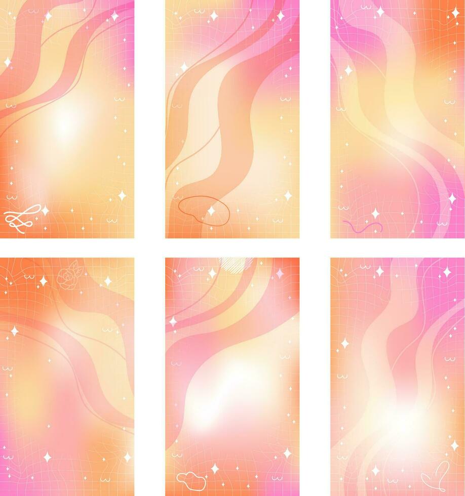 Trendy set of yellow orange pink blurry mesh gradient abstract storis template background with copy space and hand drawn Kawaii Y2K line and wave elements smooth and rounded doodles Pro Vector