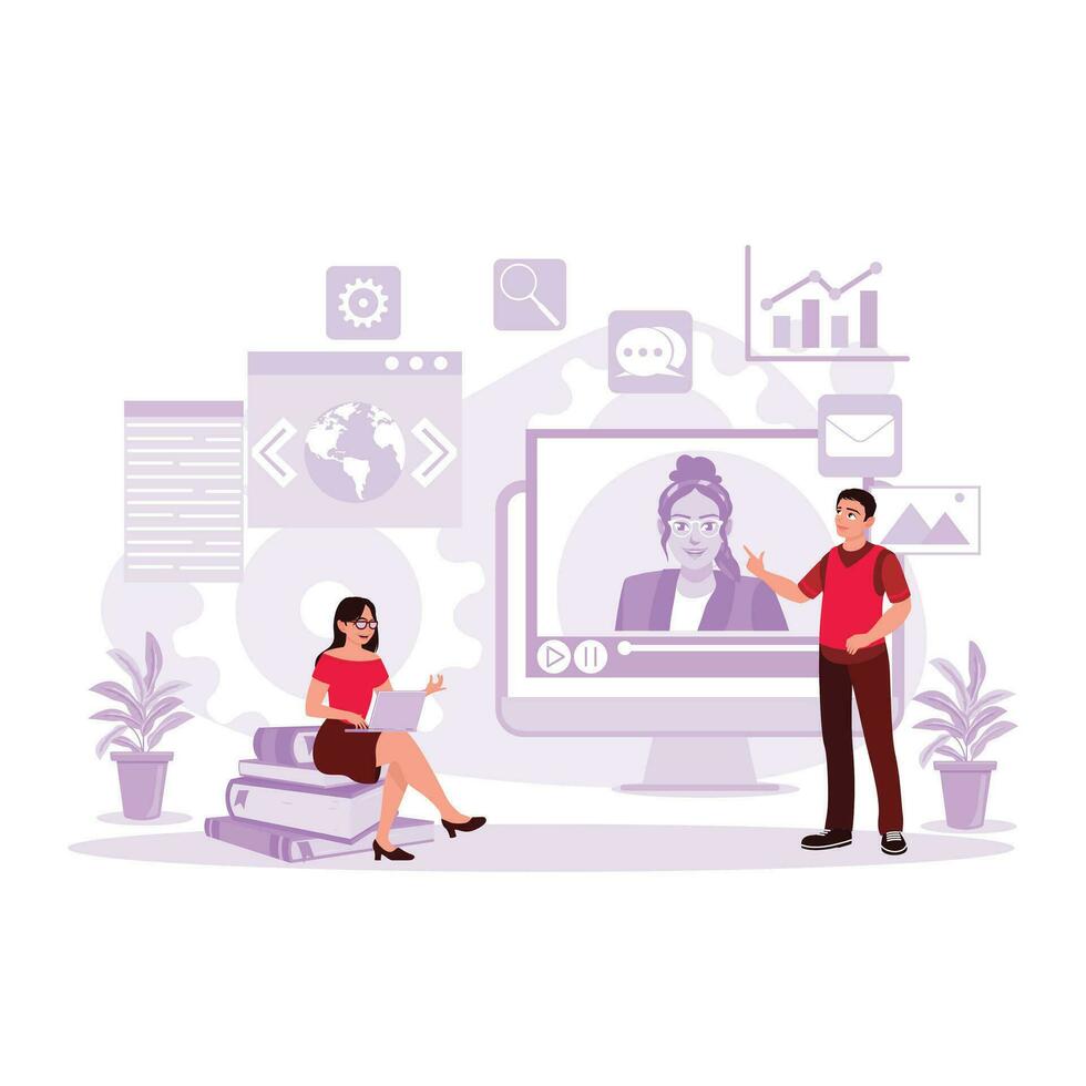 Concept of online education and e-learning for college students. Distance learning using a computer and internet connection. Trend Modern vector flat illustration. Pro Vector