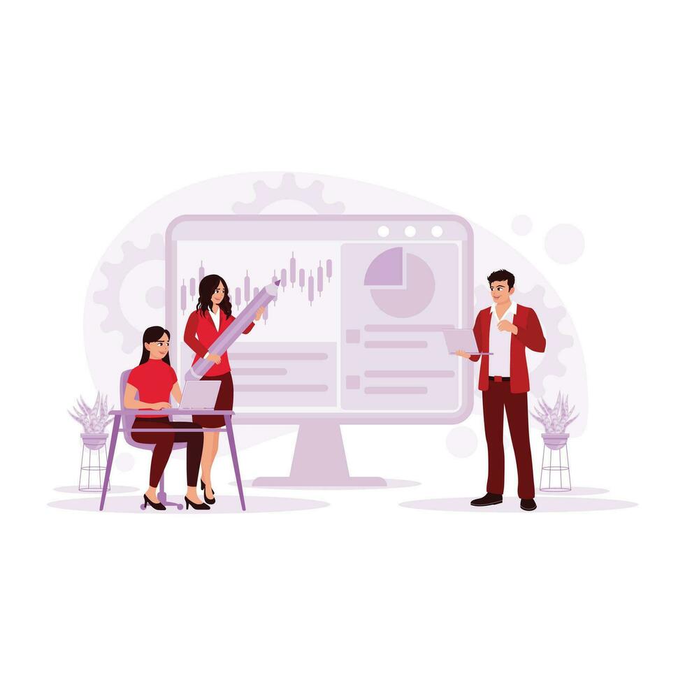 Young male manager, presenting business in front of teammates, explaining diagrams, graphs and statistical data. Two female teammates are watching with laptops and pencils. Pro Vector