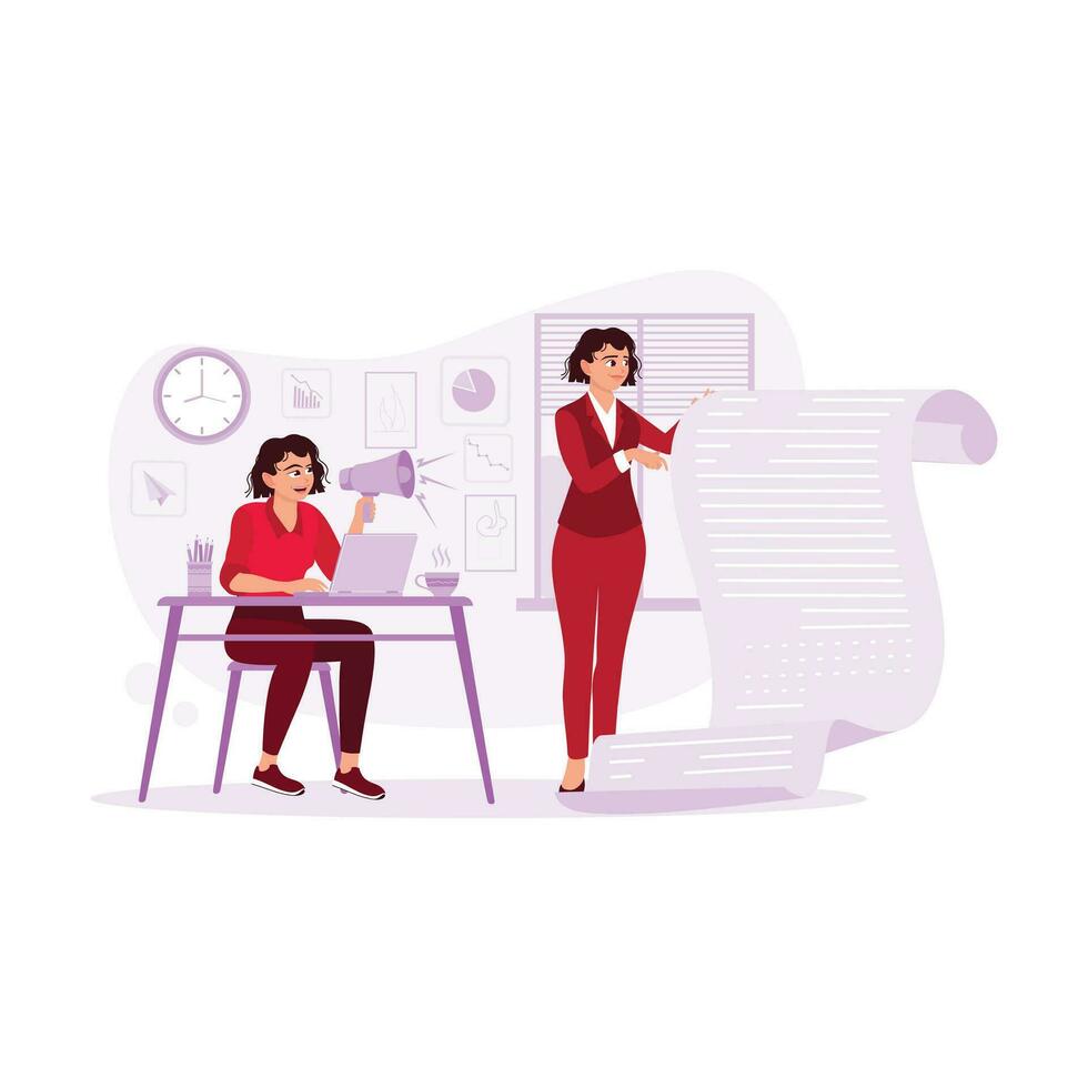Two female workers in the office, one of them sits at a table with a laptop in front and shouts into a magazine. The other worker holds a paper and starts explaining. Pro Vector