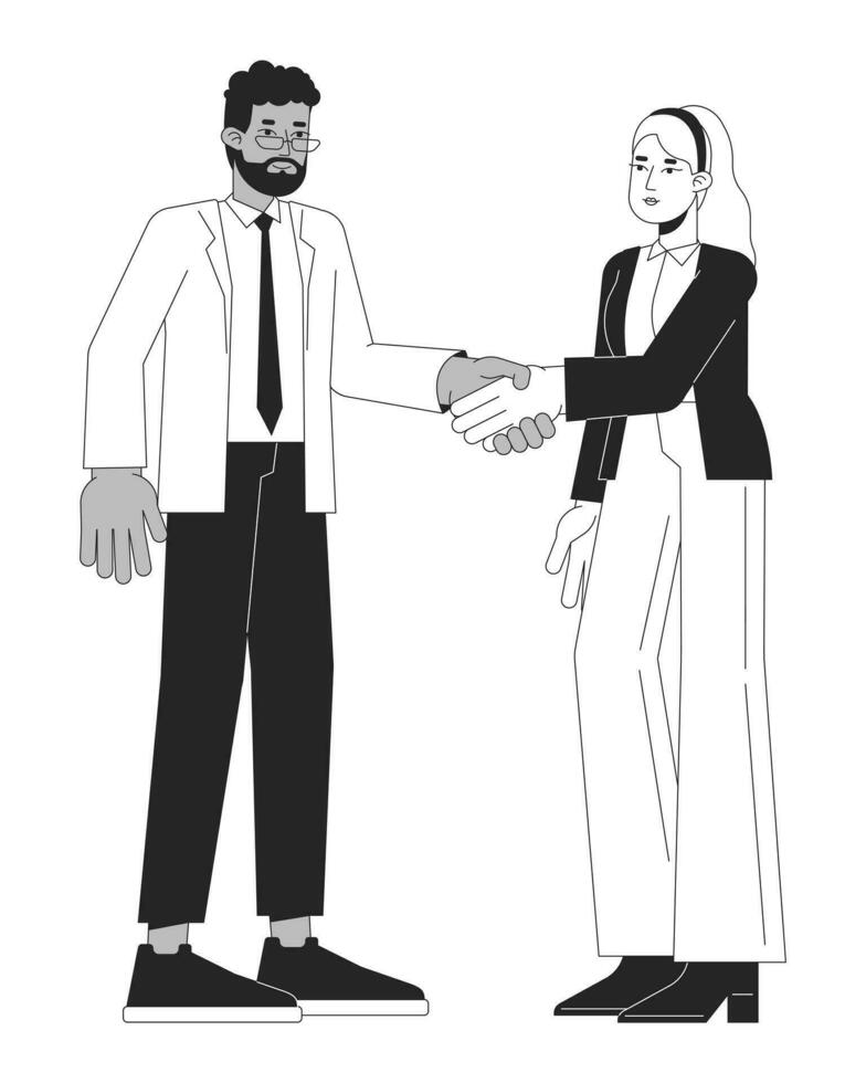 Networking businesspeople bw vector spot illustration. Hands shaking diversity 2D cartoon flat line monochromatic characters for web UI design. Handshake editable isolated outline hero image Pro Vector