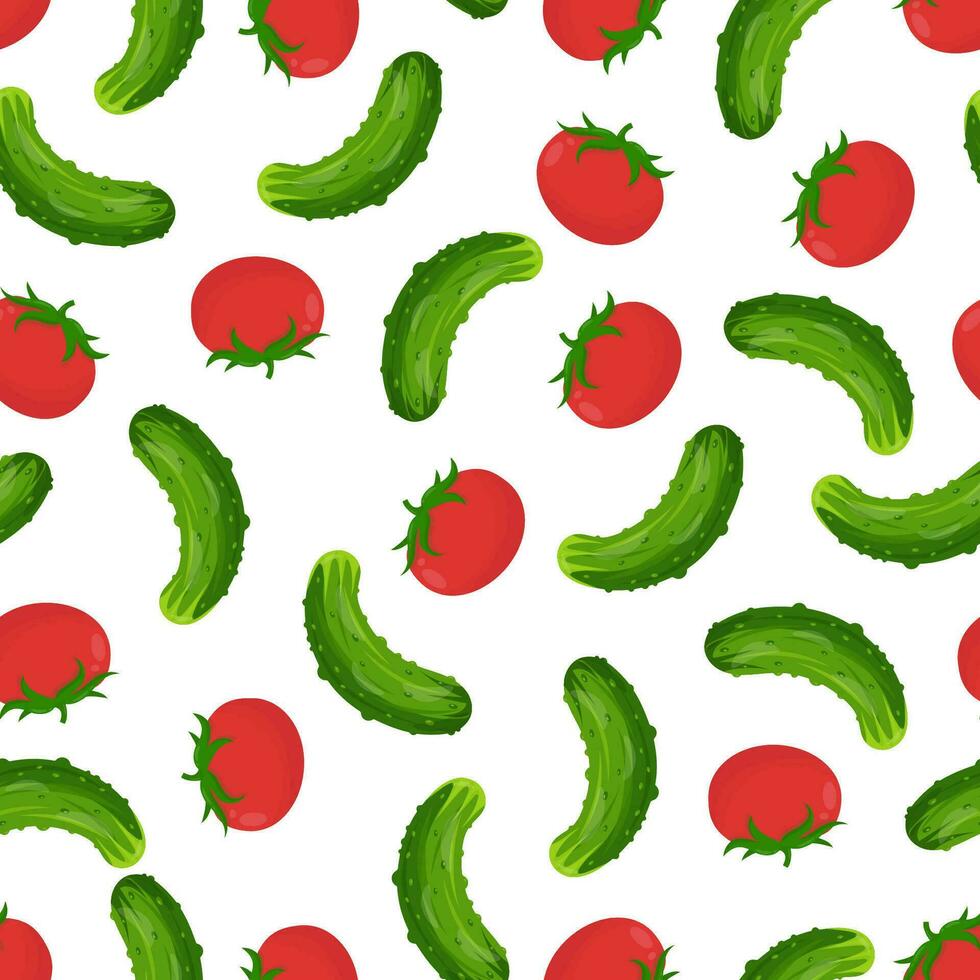 Seamless pattern with green cucumbers and red tomatoes on a white background. Pattern and vegetables Pro Vector