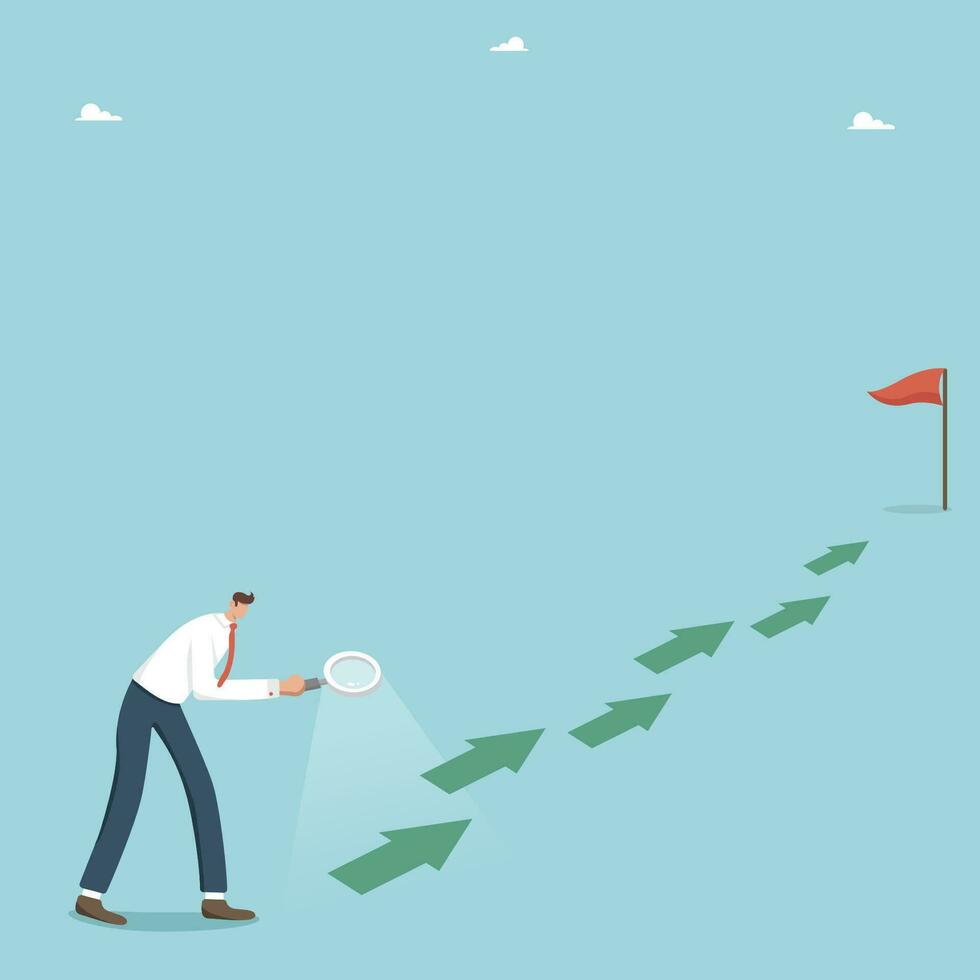 Search for strategy or way to achieve goals, successful business planning, logical thinking and intuition in solving tasks, career growth, man with magnifying glass follows arrows to the finish line. Pro Vector