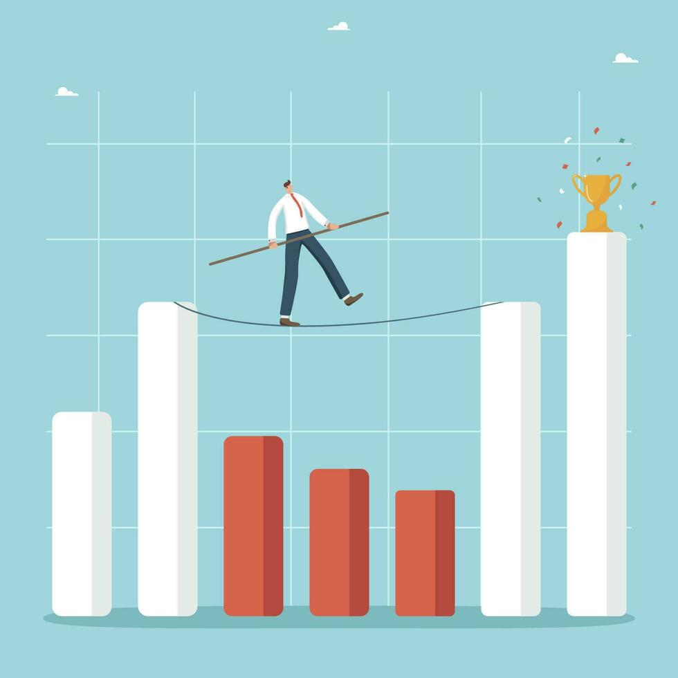 Choosing right strategy for increasing income and profits during economic crisis, analyzing and predicting changes in business, recovering a business after a recession, man walks a tightrope on graph. Pro Vector