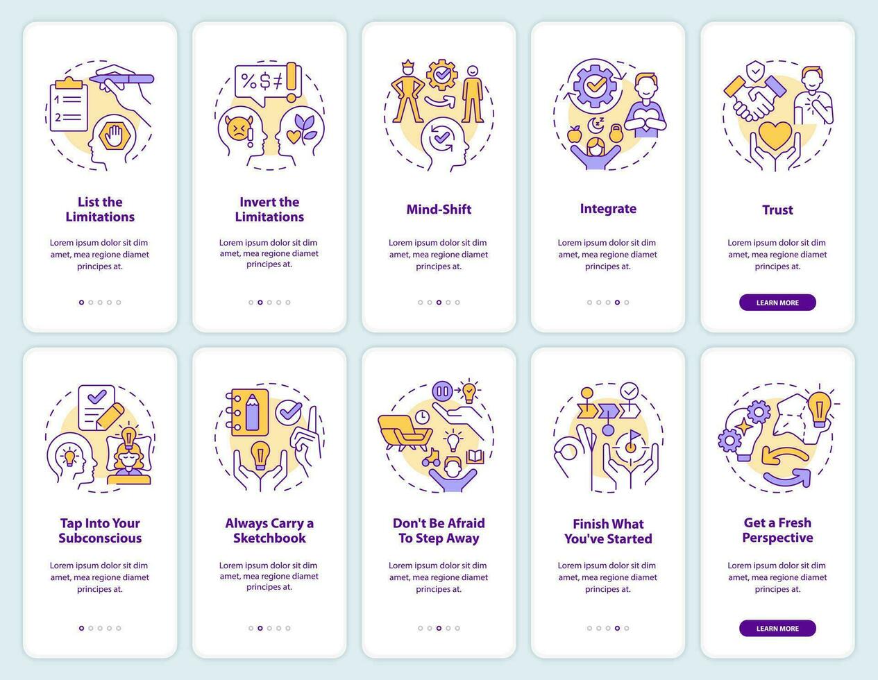 Overcome limitations onboarding mobile app screen set. Creative block walkthrough 5 steps editable graphic instructions with linear concepts. UI, UX, GUI templated Pro Vector